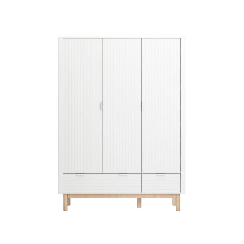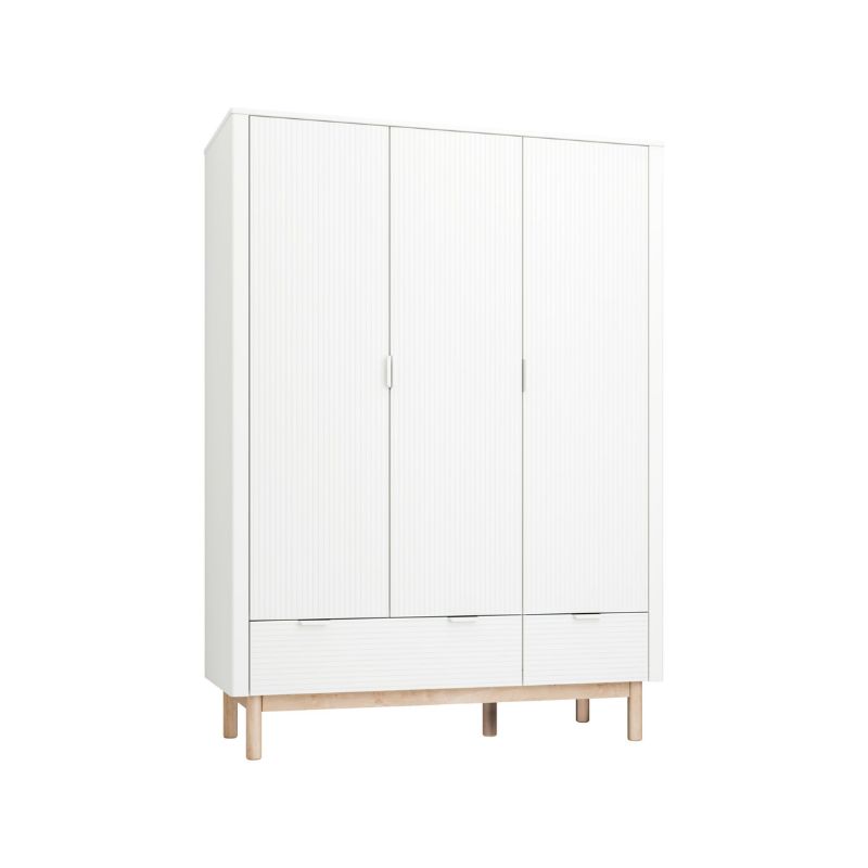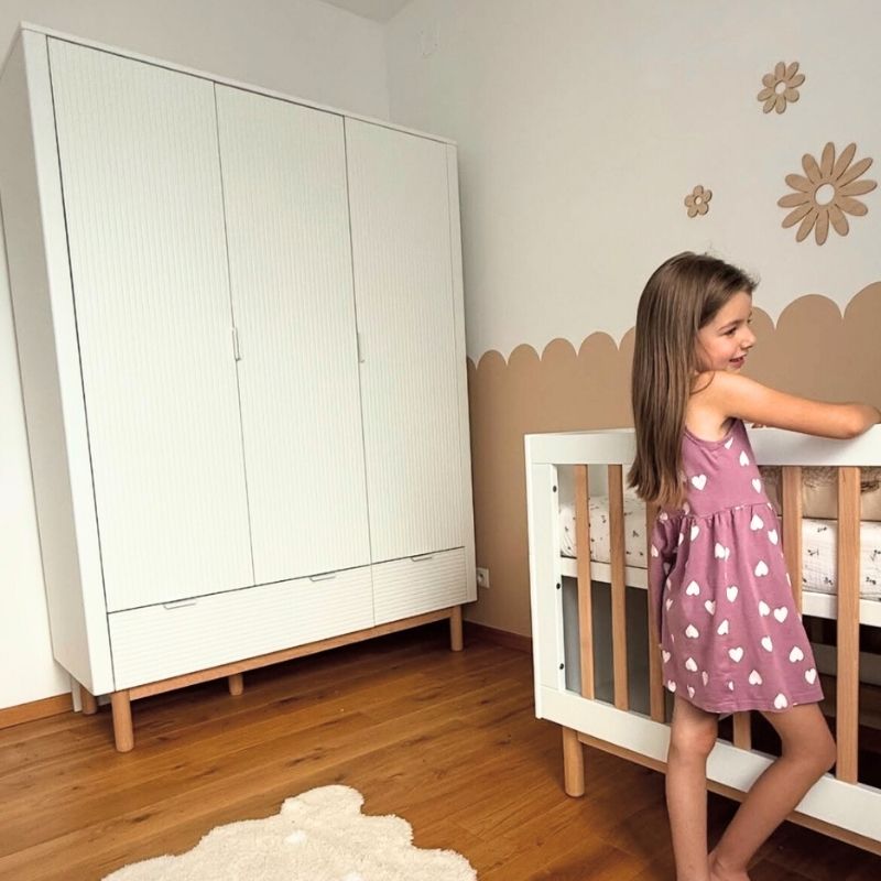 De 3-deurs kledingkast wit zegt het al, een chic design in babykamermeubels. Op zoek naar een kledingkast die functioneel, degelijk en prachtig is vormgegeven? De elegante kast van de Miloo kinderkamer collectie is een echte eyecatcher door de kleur, het subtiele streepjes patroon en de toevoeging van het beukenhout. Het ontwerp van deze lijn babykamer meubeltjes van Pinio geeft het baby interieur een unieke charme.