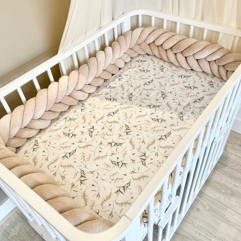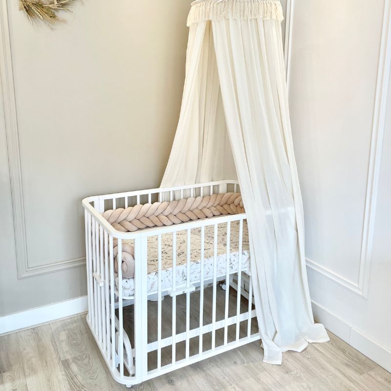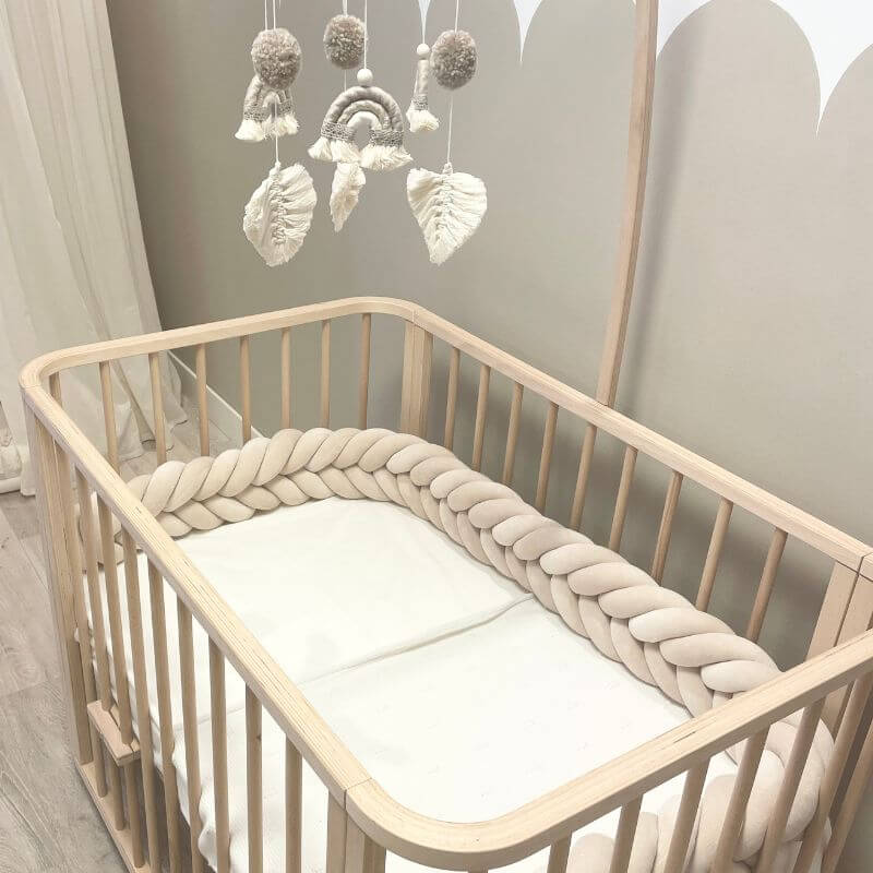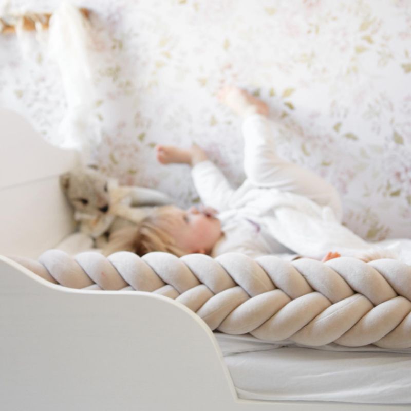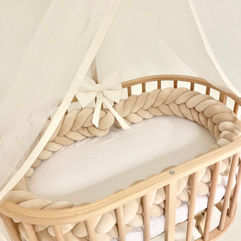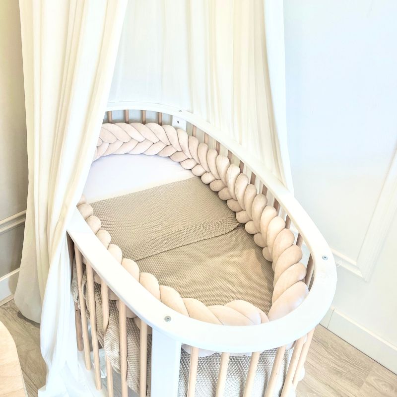 De prachtige bedomrander is geschikt voor in een ledikant of een ovaal wiegje. De vlecht bumper van 230 cm past precies aan drie kanten in de co-sleeper ledikant (110×70)van BabyRace en in zijn geheel in het ovaal wiegje van BabyRace (90x50cm). De vlecht bumper van 260 cm past precies in de ronde zwarte box van Buxibo/Puk en het ovaal ledikantje (120x60cm) van Songes et Rigolades. De lengte van 200cm past precies in de co-sleeper wiegen van Babybay. De lengte van 240 cm past aan drie kanten van een universeel ledikant van 120x60cm. De lengte van 270 cm past precies in de ronde box van Eurobaby. De lengte van 280 cm past precies in de Bopita ronde box (diameter 95cm). De lengte van 310 cm past precies in de 7-1 ovale wieg/ledikantjes in ledikant modus. De lengte van 310 past ook precies in een vierkante box. Veilig voor ledikantjes waar de bumper strak zit tegen de randen/spijlen en niet om kan vallen. De babybed bumper dient als anti-stootrand en biedt geborgenheid in de eerste paar maandjes van je newborn baby.